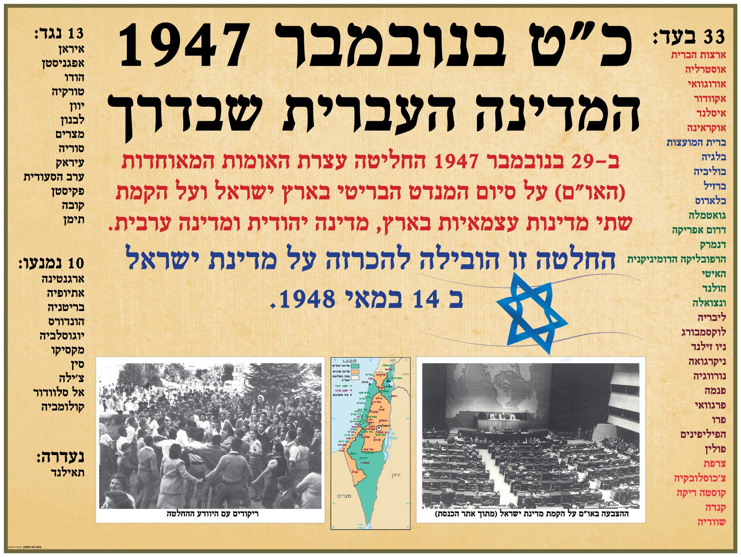 בכרזה הסבר אודות חשיבותו של תאריך זה, תכנית החלוקה, שמות המדינות שהצביעו בעד ונגד, מפת תכנית החלוקה ע”פ האו”ם ותמונות הקשורות לארוע